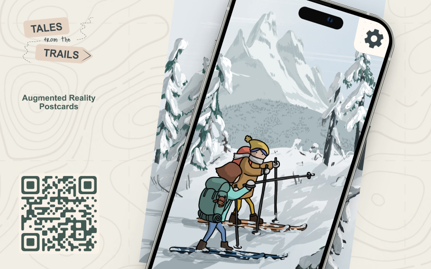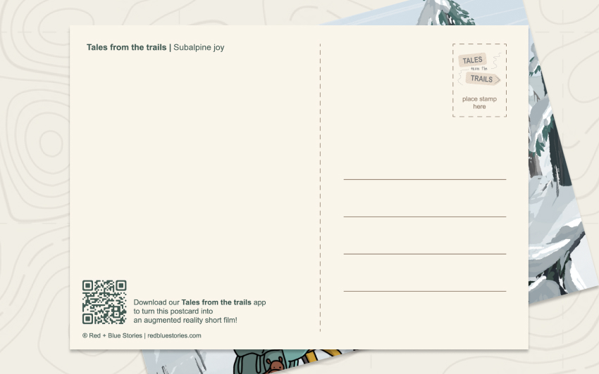 Ski season is around the corner! Yay, we are excited! Send a postcard to someone you want to go shred with! This is not just a postcard though - it is a postcard with an interactive twist! This postcard’s illustration turns into a short animated film, revealed in Augmented Reality using our free companion app available on iOS and Android. There is a QR code on the back of the postcard so that you, and whoever you send the postcard to, can enjoy the story hidden in the illustration. Subalpine Joy is part of our Tales From The Trails postcards collection, all about telling short stories that happen on, and around the (mountain) trails.